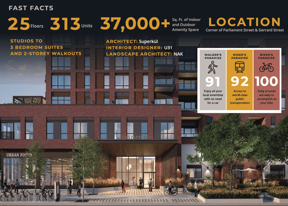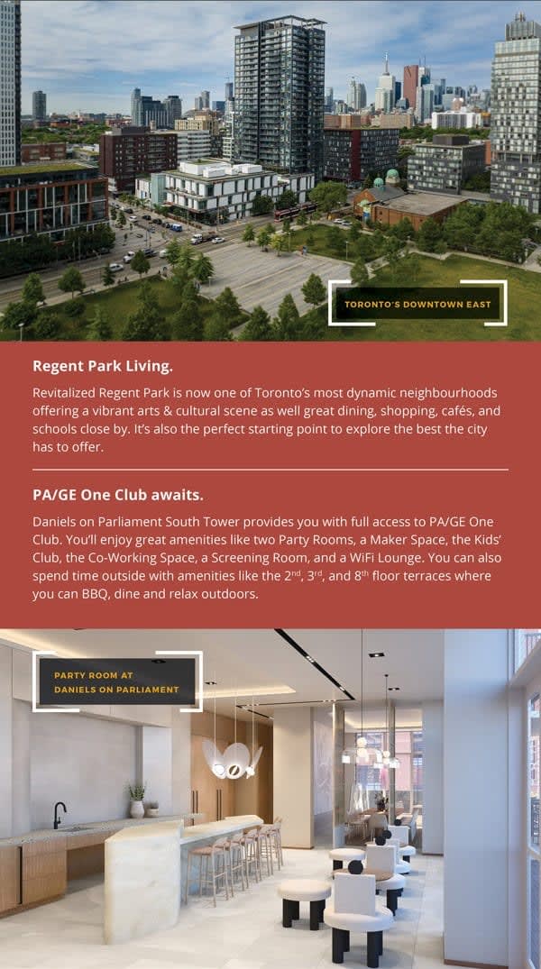 Experience the epitome of high-rise urban living at the newest addition to downtown Toronto -- Daniels on Parliament South Tower. From your own beautifully considered suite to the best-in-condominium amenities, including a fitness center, rooftop terrace, lounge, co-working space and more -- Daniels on Parliament South Tower offers the perfect blend of sophistication and convenience.