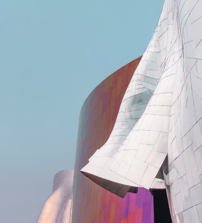 Inspired by Jimi Hendrix, the Frank Gehry–designed shrine to pop culture sits beneath the Seattle Space Needle. To convey the fluidity of music, Gehry encased the outside of the building in 21,000 individually cut and shaped stainless steel and painted aluminum shingles that reflect a myriad of colours.