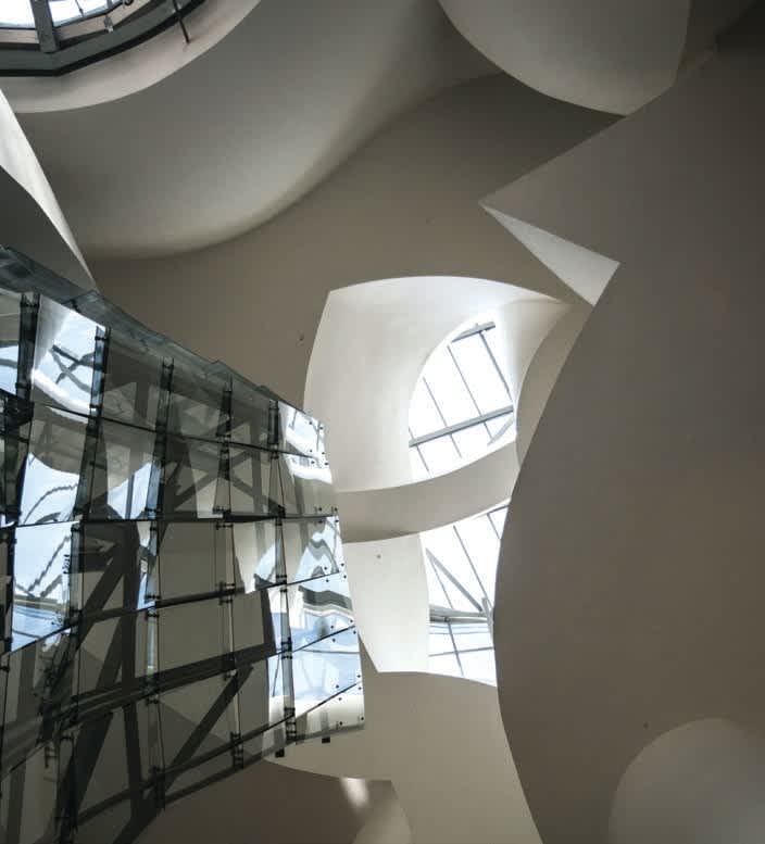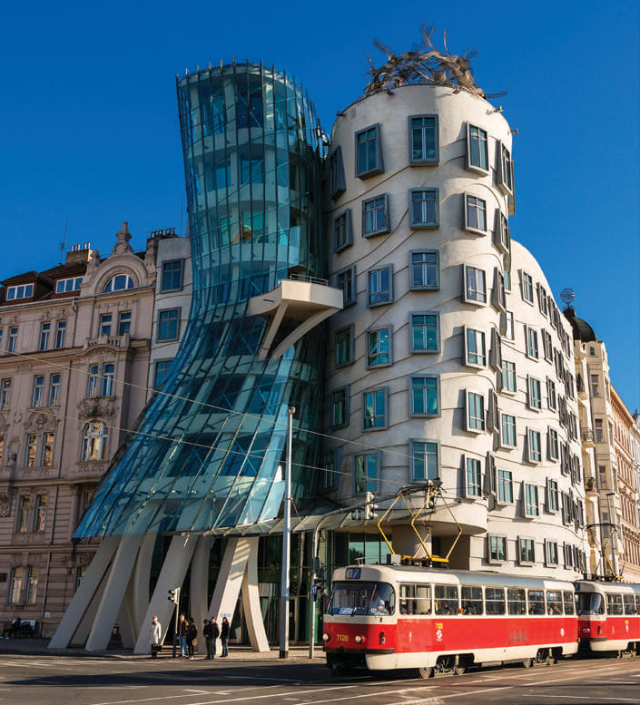 The Nationale-Nederlanden building in Prague, a collaboration between Gehry and architect Vlado Milunić, resembles an embrace shared between dancers. The nine-storey structure – which houses a hotel, offices, and a restaurant named Ginger and Fred – consists of a glass tower supported by curved pillars, as well as concrete waves and unaligned windows.