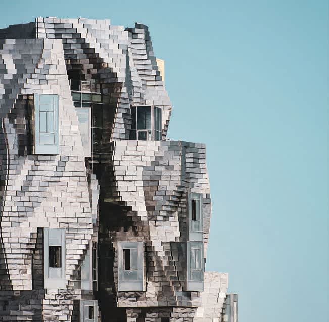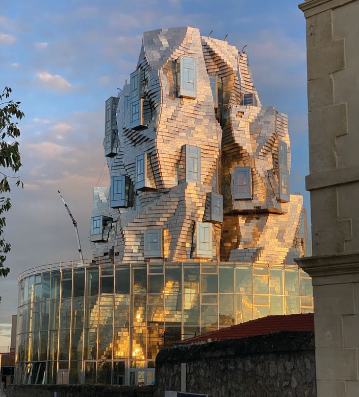 The stainless-steel-clad tower is the centrepiece of this world-renowned arts and culture institution located in the South of France. Inspired by such design references as Arles’s Roman architecture, the nearby mountain range, and Vincent van Gogh’s Starry Night painting, the castlelike structure features extruded windows and a scaly, stepped exterior.
