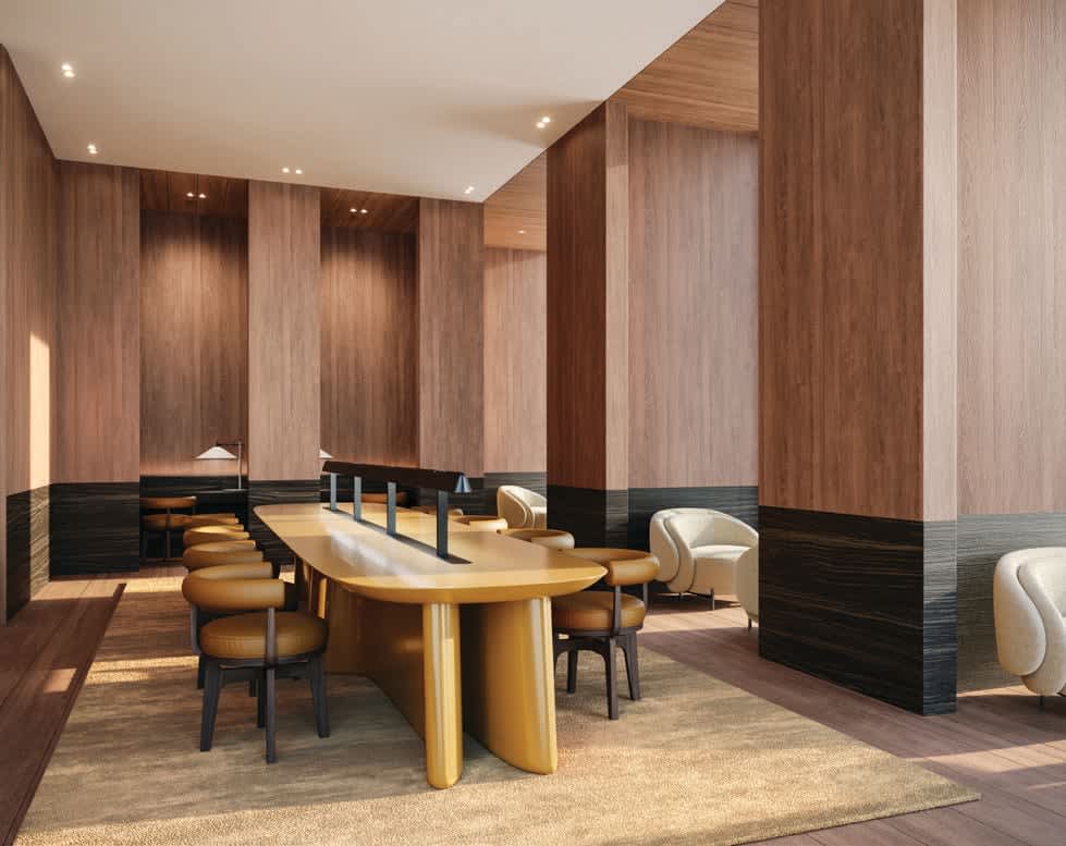 The amenity program achieves this and more. “We leaned into a usercentric approach,” says Ferrari, “and divided the amenities into three sections: entertaining and hospitality, health and wellness, and coworking. Each is purposefully located within the tower, with no crossover between activities. These are flexible but purposeful spaces.”
